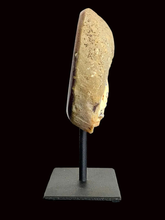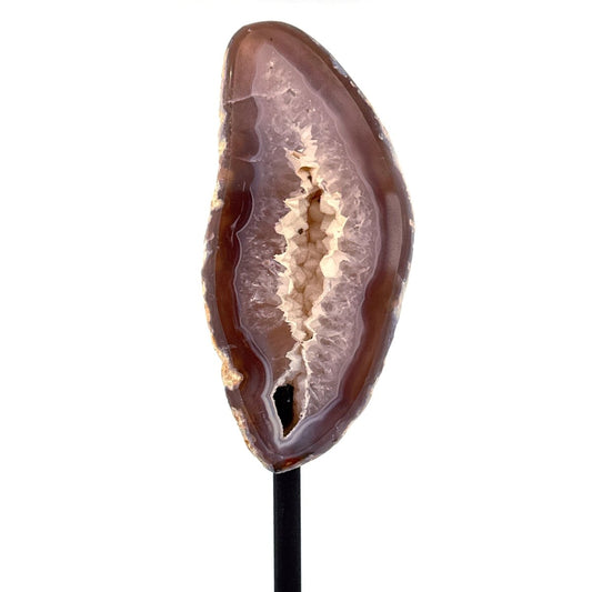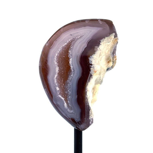 Our Agates on Stand collection showcases carefully selected natural agate specimens, presented on sturdy stands for elegant display. Each piece reveals the beauty of agate layered banding, polished rims, and often sparkling quartz crystal interiors.