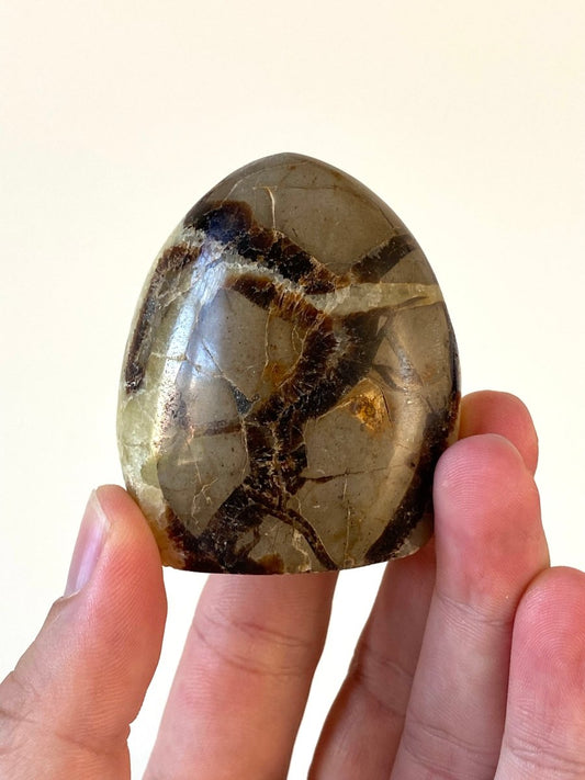 Septarian pieces are formed through a process where ancient sea life and sediment collected on the ocean floor, eventually drying and cracking over time. Minerals then crystallized within these cracks, creating the unique patterns you see today. Septarians are often found in regions like Utah, Madagascar, and Morocco.